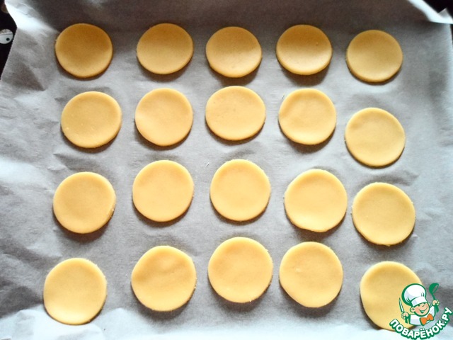 Далее я разделила тесто на 2 равные части. Одну - убрала в морозилку для другой выпечки, из второй части я делаю пирожные. Из теста раскатать пласт толщиной примерно 4 мм. Для пирожных вырезать кружки диаметром 5 см. Выложить кружки на пергамент и убрать в морозилку минимум на 15 минут.