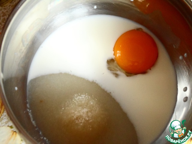 В это время делаем крем. Смешать в кастрюльке молоко, сахар и желток. Поставить на плиту на средний огонь, довести до кипения и варить 4-5 минут, постоянно помешивая. Снять с огня и остудить до комнатной температуры.
