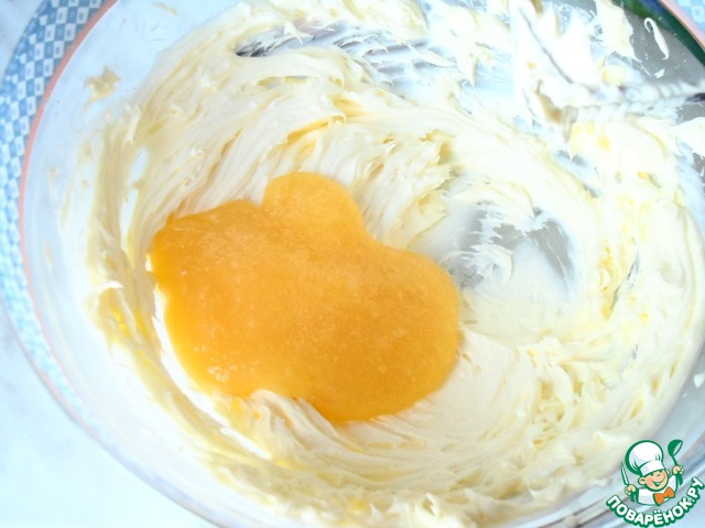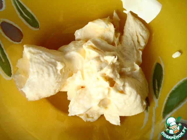 Взбить размягченное сливочное масло до пушистости. Постепенно добавлять к маслу остывшую желтковую смесь, продолжая взбивать.