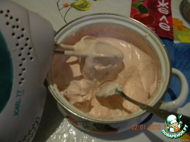 Распустить желатин. Взбить сливки с сахаром добавить желатин. Разделить массу на 2 части.