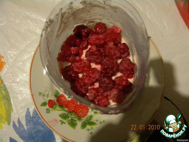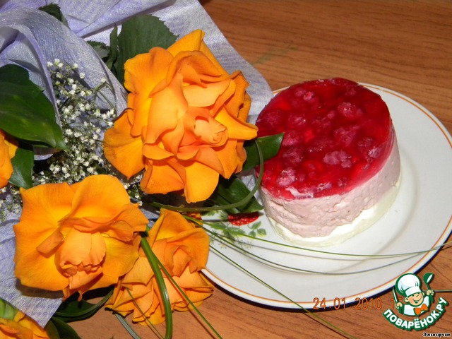 Белые сливки выложить, сверху розовые (подкрасить соком от растаявших ягод). Дать застыть в холоде. Затем ягодки и разведенное желе. И снова в холод.
