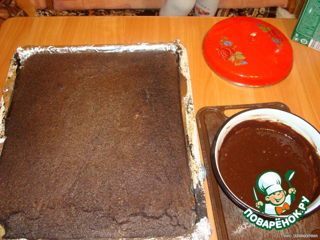 ГЛАЗУРЬ: 5 ст. ложек сметаны, 5 ст. ложек сахара, 5 ст. ложек какао- порошка, 50 гр сливочного масла.