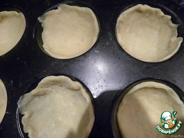 Тесто раскатать, вырезать кружочки, уложить в формы (формы предварительно смазать маслом) и выпекать в духовке 30минут при 180градусах.