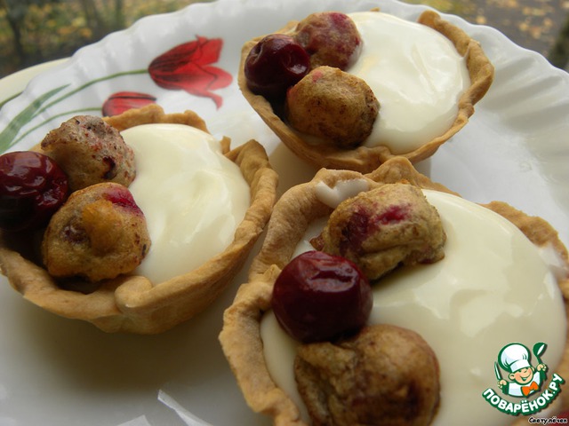 Для начинки взбиваем жирную сметану (я брала 30 проц.) с сахарной пудрой, выкладываем в тарталетки и украшаем вишенками. Приятного аппетита!