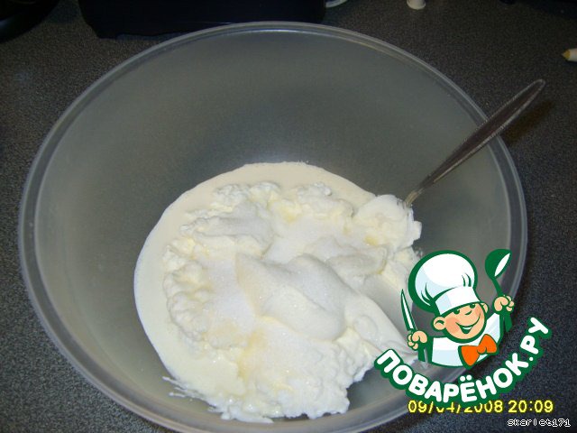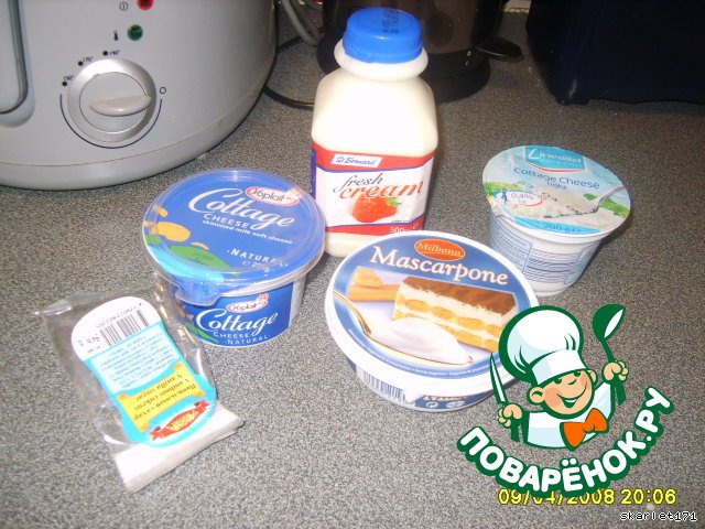 Творог, маскарпоне, сливки, ванильный сахар, сахар-песок.
