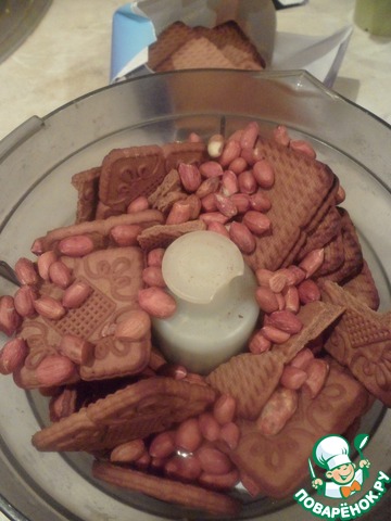 Шоколадное печенье с любыми любимыми орехами, у меня был арахис, измельчить в крошку в комбайне.