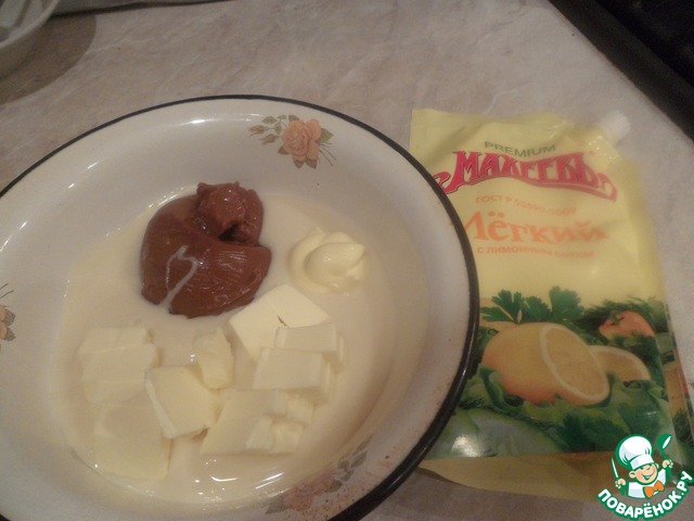 Делаем заправку. Смешать сгущенное молоко, вареную сгущенку, сливочное масло и майонез Махеевъ Легкий с лимонным соком в однородную массу, добавить 1 ст. л. какао и перемешать.