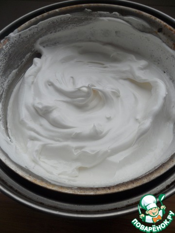 В это время делаем белковый крем. Белки взбить миксером с яблочным уксусом, сахаром и ванилином в стойкую белую массу.