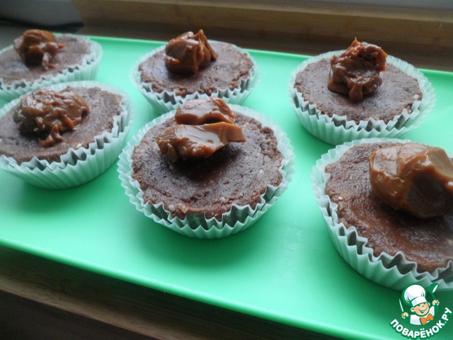 Наши кексы достать из холодильника, вынуть из металлических форм, на середину каждого положить по 1 ч. л. вареной сгущенки (можно заменить цукатами или фруктами).