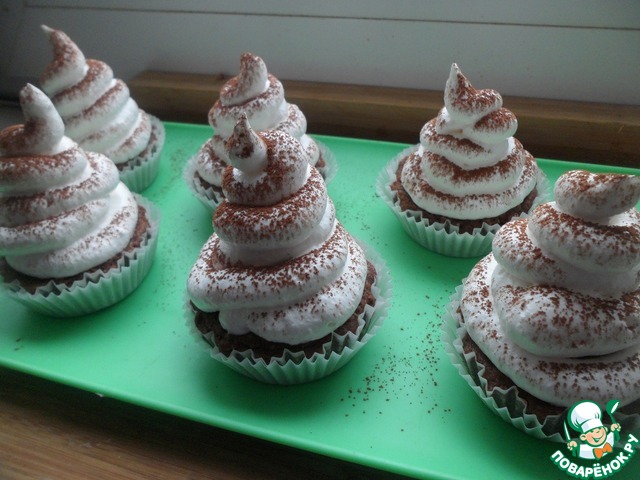 Украсить кексы сверху нашим белковым кремом. Можно поверх крема посыпать через ситечко какао для украшения.