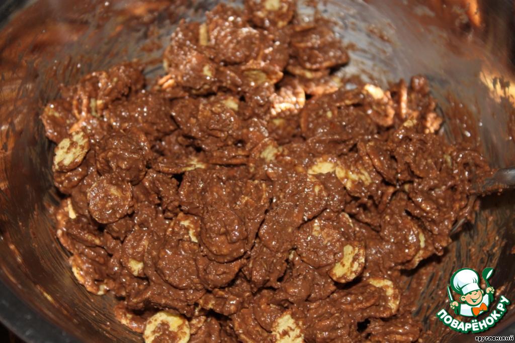 Подмешайте кукурузные хлопья и рубленый миндаль.