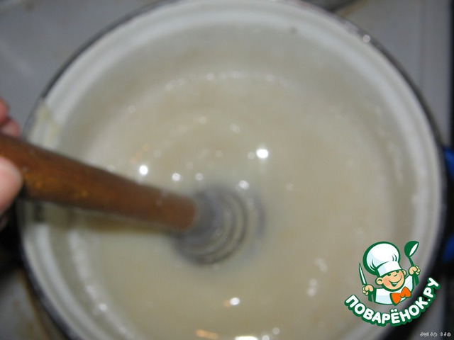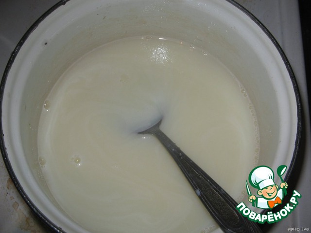 Молоко я нагреваю не всё. В небольшое количество я вмешиваю тщательно муку. Когда молоко с сахаром дойдёт до кипения, ввожу молоко с мукой и тщательно перемешиваю. Варить нужно до появления пузырьков. Мешать постоянно.