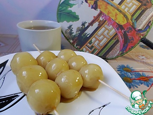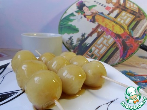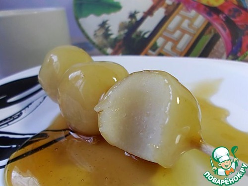 | Данго - это рисовые лепешки моти круглой формы, насаженные на шампур обычно по 3-5 штук. История этого десерта насчитывает века, широкое распространение он получил в XIX веке и до сих пор пользуется неизменной любовью среди японцев. Существует огромное разнообразие вариаций данго с различными добавками (фасоль, яйцо, зеленый чай, соевая мука и т. д.), отличающихся формой и цветом. Я бы хотела рассказать об одном из самых популярных сортов данго - митараши-данго, которое является разновидностью куси-данго, покрытое соусом митараши - сиропом на основе сахара и соевого соуса. По-настоящему любое данго готовится из рисовой муки, в которой обязательно должны быть смешаны в нужной пропорции несколько сортов риса обычного и клейкого. Я же попробовала повторить этот десерт из рисовой муки, сделанной самостоятельно, поэтому на не претендую на полное совпадение с оригиналом. |