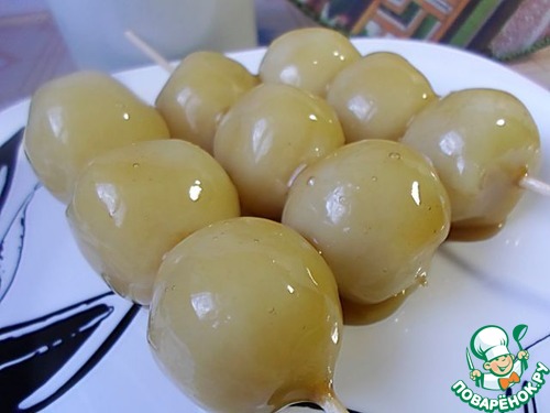 Нанизываем полуостывшие рисовые лепешки на деревянные шпажки по 3 штуки. В Японии вместо деревянных шпажек используются тонкие бамбуковые палочки. Если хотите приготовить данго еще ближе к оригиналу, обжарьте каждую штучку на сковородке-гриль до появления румяных полосок.