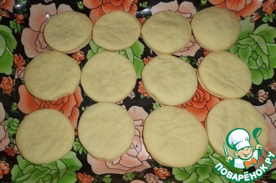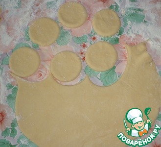 Тесто раскатать в пласт (3-5 мм) и вырезать кружочки. Я вырезала стаканом (200г). Обрезки также запечь, затем сделать из них крошку.
