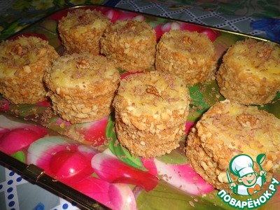 Пирожное состоит из трех кружочков. Смазываем нутеллой каждый кружочек и соединяем друг с другом, посыпая грецкими орехами. Бока смазать нутеллой и обвалять в крошке. Верх оставляем пустым.