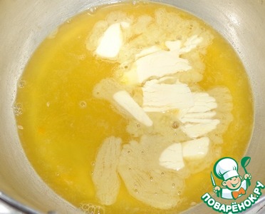Апельсиновый сок вылить в кастрюльку и поставить на медленный огонь. Добавить сахар и сливочное масло. Проварить 5-7 минут.