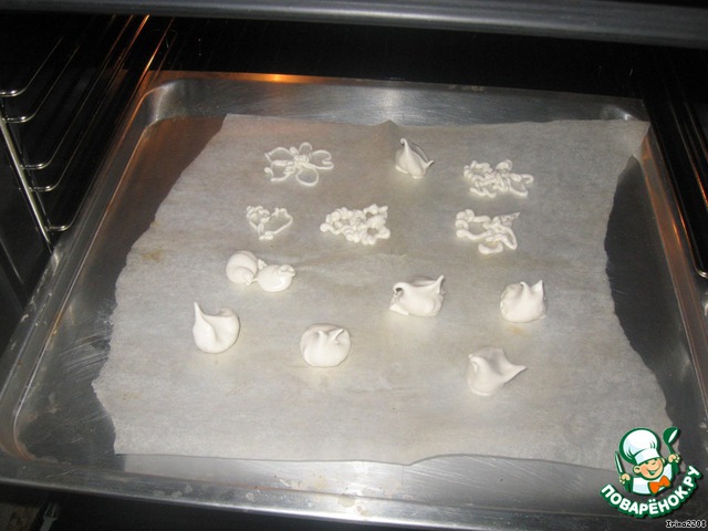 А из оставшегося белка я сделала украшения - испекла безешки, часть чайной ложкой выкладывала, часть мешочком из пергаментной бумаги и пустым одноразовым шприцем (но им оказалось неудобно работать).