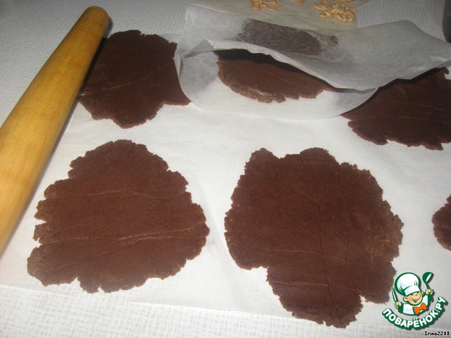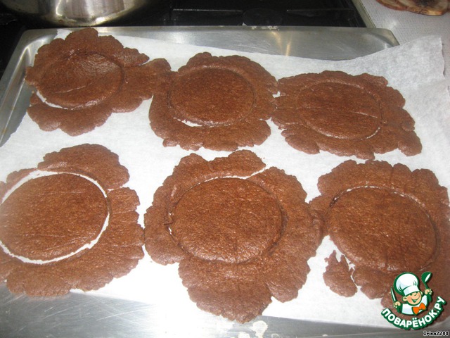 Испеченные горячие коржи сразу же вырезаем по форме пирожных (чашкой) и обрезаем ножом. Обрезки я измельчила и пустила в дело.