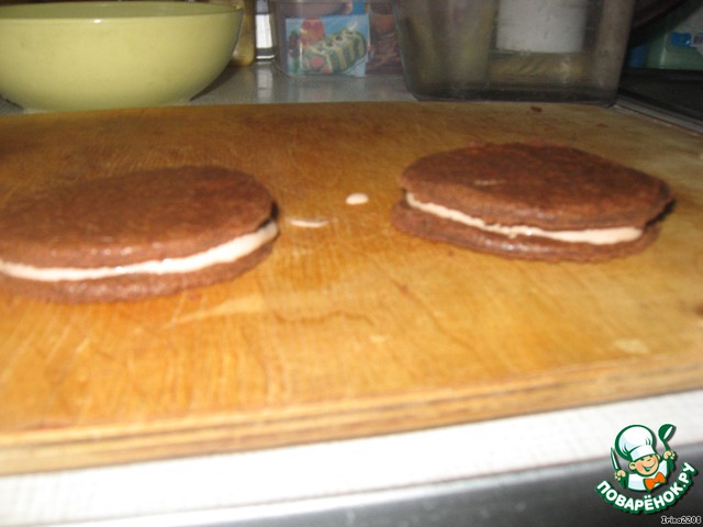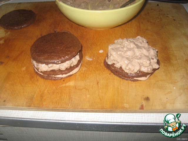Можно просто промазать кремом коржи (особенно, если берете двойную порцию ингредиентов, и делаете торт). Но я сделала так - нижние коржики промазала кремом, на них положила средние коржики.