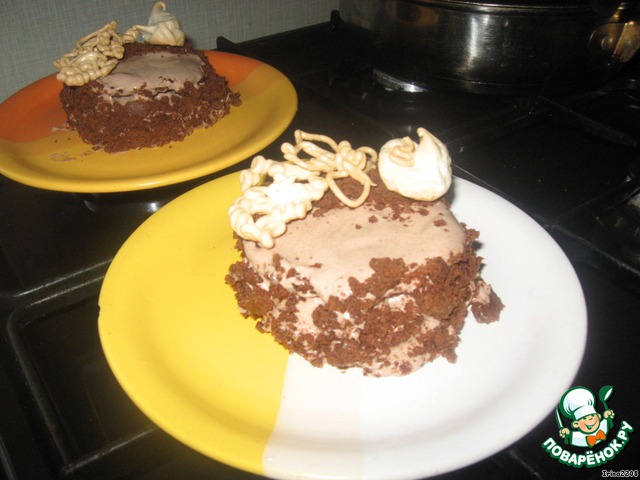 Обмазать верх и бока кремом, обсыпать оставшейся крошкой. Украсить безе. А если вы делаете торт и берете двойную порцию продуктов, то вот вам рецепт замечательной сметанной глазури (очень вкусная) - 4 ст.л. какао, 4 ст.л. сахара, 5 ст.л. сметаны и ванилин. Все прогреть до растворения сахара, украсить верх. Приятного аппетита!