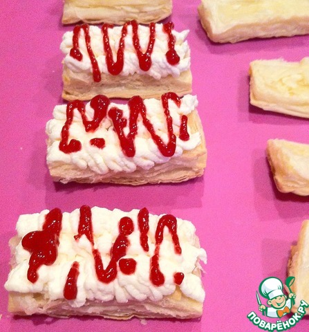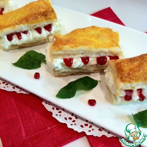Пласт теста разрезать на 8 одинаковых прямоугольников. Смазать желтком, присыпать сахаром и выпекать 10 минут при 230 градусах.