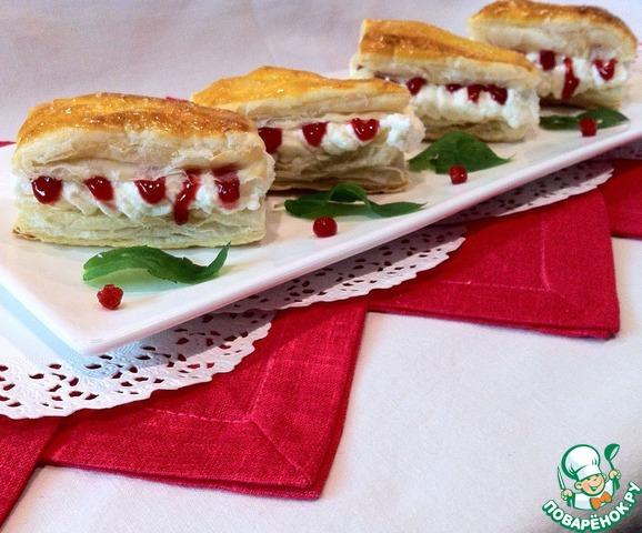 Остывшие ломтики разрезать вдоль на две части. Нанести крем из маскарпоне и брусничный соус.