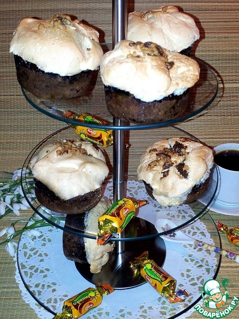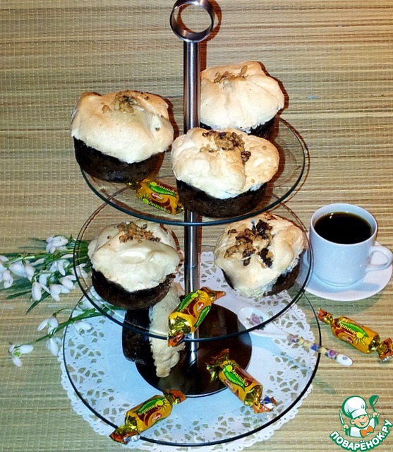 Формочки смазать маслом, разложить в них тесто, положить по ложке джема и поставить выпекаться в разогретую духовку до 180 градусов на 15 минут. Затем формочки из духовки вынуть и положить в каждую взбитый белок. Сверху посыпать измельчённые конфеты, заранее приготовленные и выпекать до золотистого цвета белка. Узким и острым ножом отделить белок от формы и аккуратно вытряхнуть содержимое.