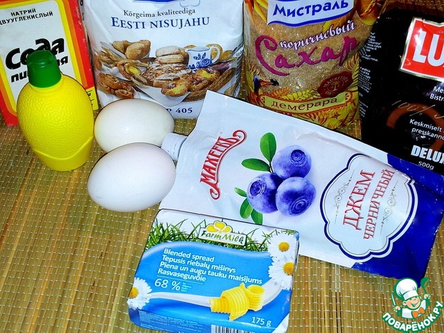 Ингредиенты - мука, сахар, кофе, джем, яйца, сода, лимонная кислота, масло.