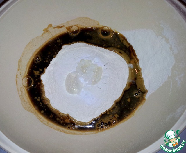 Муку просеять в миску и добавить сахар. Заварить крепкий кофе по своему вкусу и охлаждённый вылить в миску с мукой. Всыпать соду и налить лимонную кислоту. Хорошо перемешать.