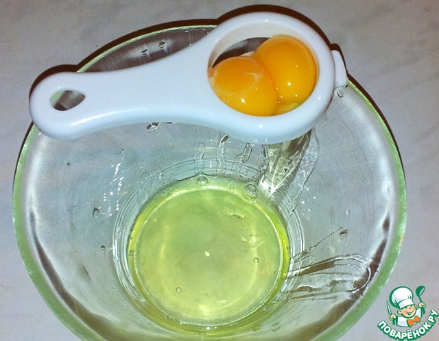 Отделить желтки от белков и миксером взбить желтки с коричневым сахаром. ( Яйца с двойным желтком ). Белки взбить с белым сахаром.