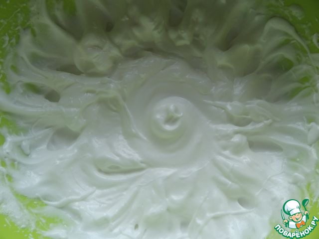 Взбить яичные белки до мягких пиков, постепенно добавить половину сахара (60 гр.), продолжая взбивать до устойчивых пиков.
