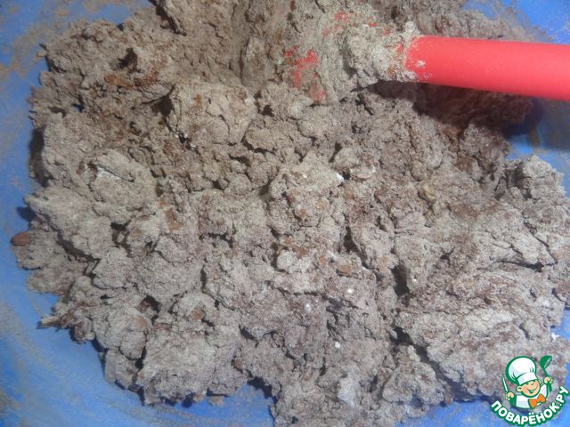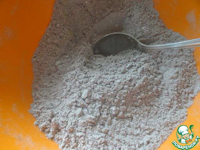 Просеянную муку смешать с крахмалом и какао.
