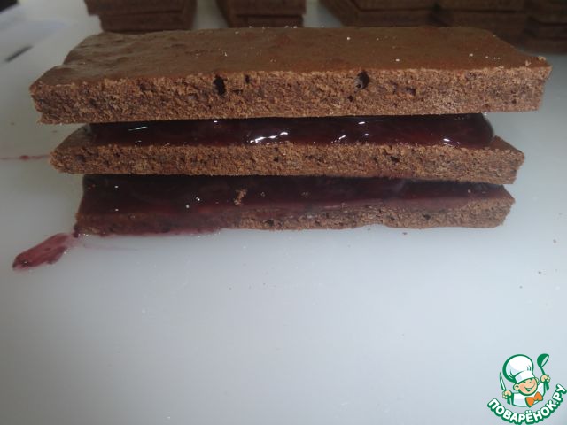 Наш бисквит разрезать на квадраты или прямоугольники, так, чтобы на одно пирожное было три слоя.