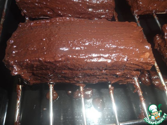 Ставим решетку на противень и сверху выкладываем пирожные. Поливаем со всех сторон шоколадом. После я отправила их на ночь в холодильник! Они пропитались и стали очень вкусными!