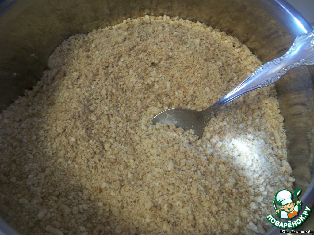 Пока остужается крем, измельчаем кулич. У меня оставалась пара куличей, которые при выпекании немного подгорели внизу, так как пеклись последними, а дело было уже под утро, и я, видимо от усталости, немного их проследила. Подгоревшую часть я сразу же обрезала, но куличи были уже испорчены. Теперь пришло время их использовать. Я измельчала на мясорубке кулич, печенье и вот такие сухарики.