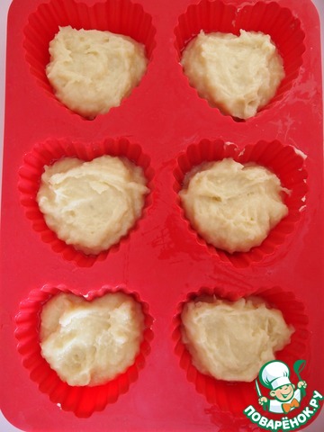Далее разложить тесто по столовой ложке в силиконовые формочки. Отправить в духовку, заранее разогретую до 190 градусов на 25 минут, затем снизить температуру до 170 градусов и выпекать 20 минут, далее снизить температуру до 150 градусов и выпекать еще 20 минут. Выключить духовку и оставить форму с пирожными до полного остывания духовки (при выпекании духовку не открывать!!!).