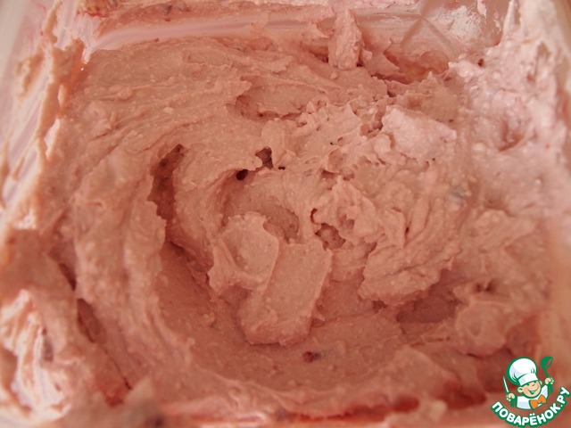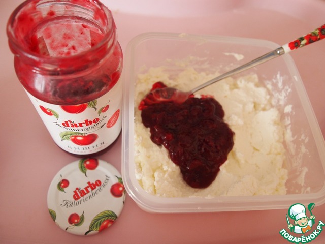 Пока выпекаются пирожные, приготовить начинку. Для этого творог смешать с вишневым низкокалорийным конфитюром d"arbo.