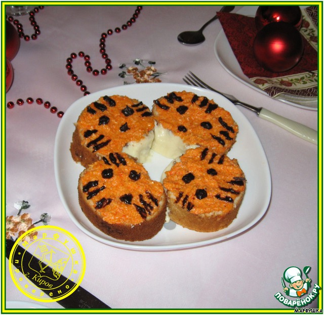 Крем с кокосовой стружкой приобрел оранжевый цвет, его-то я и поместила сверху пирожных. Затем растопила кусочек шоколада и попыталась сделать мордочки ;-) .