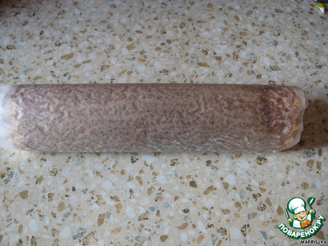 Сворачиваем в рулет и ставим остывать. Остывший рулет разворачиваем, убираем бумагу, смазываем кремом. Нарезаем на порции.