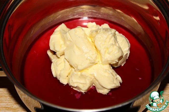 Затем приступаем к приготовлению крема из количества виски, в котором настаивалась вишенка, масла сливочного и сгущенного молока.