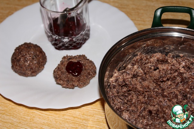 В полученный крем добавляем бисквит, тщательно перемешиваем и приступаем к формированию шариков. На небольшую лепешечку из полученной массы выкладываем ягодки, поднимая края лепешечки, придав ей форму тарелочки, сверху добавляем такое же количество массы и придаем форму шарика. У меня вышло 11 порционных шариков. Охлаждаем и можно приступать к чаепитию! Что мы и сделали ;))).