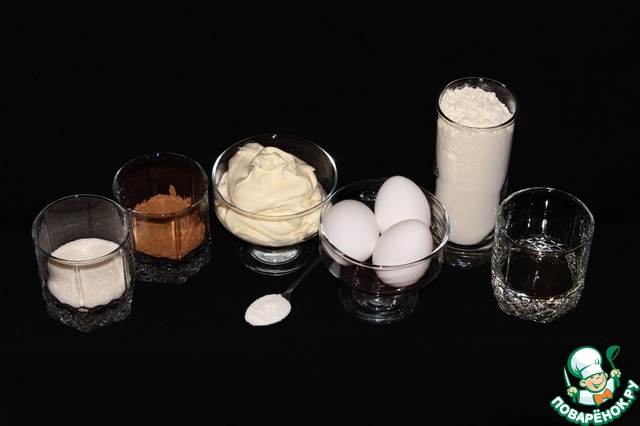 В небольшой кастрюльке последовательно смешиваем ингредиенты для основы наших шариков: 3 яйца, 1 ч. л. разрыхлителя, 3 ст. л. сахара (без горки), 4 ст. л. какао-порошка (без горки), 9 ст. л. сметаны, 5 ст. л. масла растительного и 9 ст. л. муки.