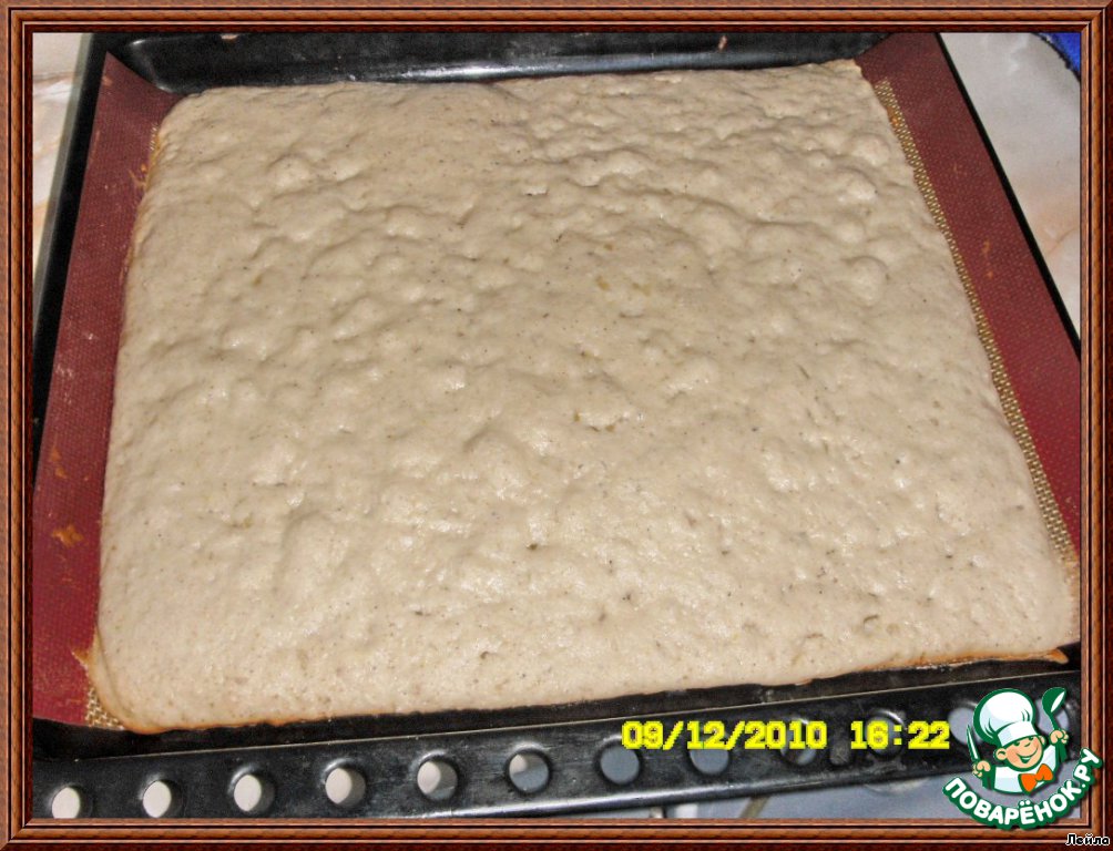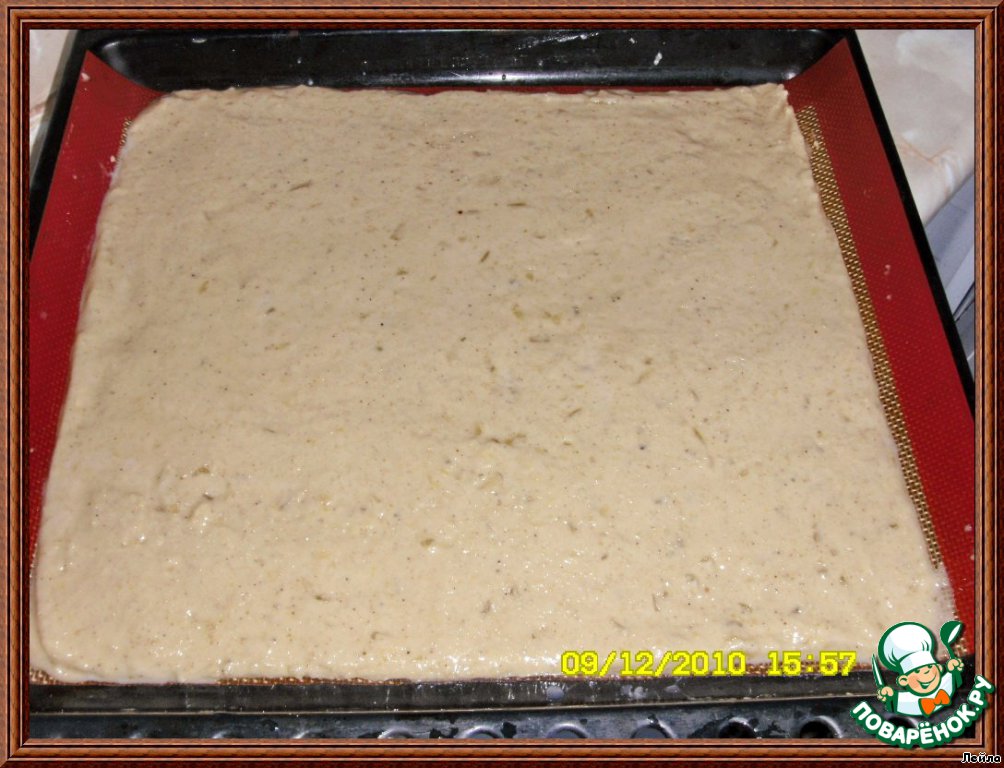 Выстелить противень пергаментом и распределить по нему тесто тонким слоем (влажными руками).