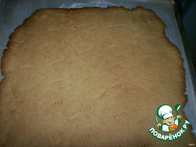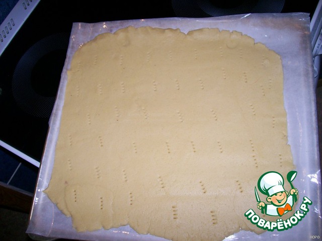 Вылежавшееся тесто раскатать в пласт толщиной 0, 8 см, по возможности ровный. У меня получился квадратный размером около 40 *40 см. Удобно раскатывать на бумаге для выпечки, т. к. тесто довольно рассыпчатое, прямо на бумаге перенести на противень, часто проколоть вилкой и выпекать в предварительно разогретой духовке при температуре 200 С 20 -25 мин (до золотистого цвета).