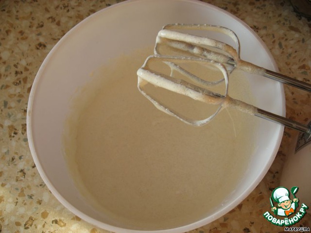 Белки отделяем от желтков. Желтки взбиваем до пены, затем добавляем сахарный песок, муку и разрыхлитель. Все взбиваем.