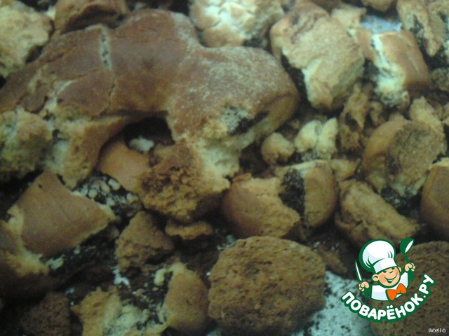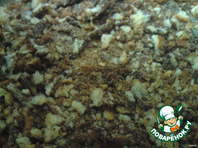 Сухари также пропускаем через мясорубку или измельчаем другими доступными средствами. Я не измельчила это как следует и у меня остались кусочки сухариков, которые заменили орехи