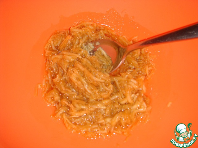 Яблоко натереть на крупной терке. Растительное масло подогреть с 4 ст. л. меда до его полного растворения, горячей смесью залить яблоки и перемешать.