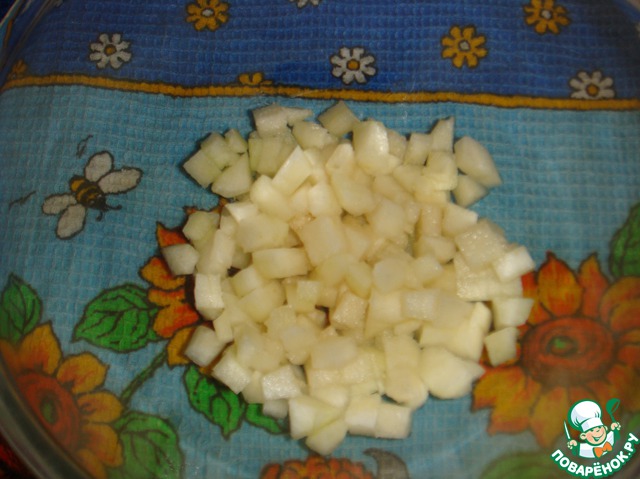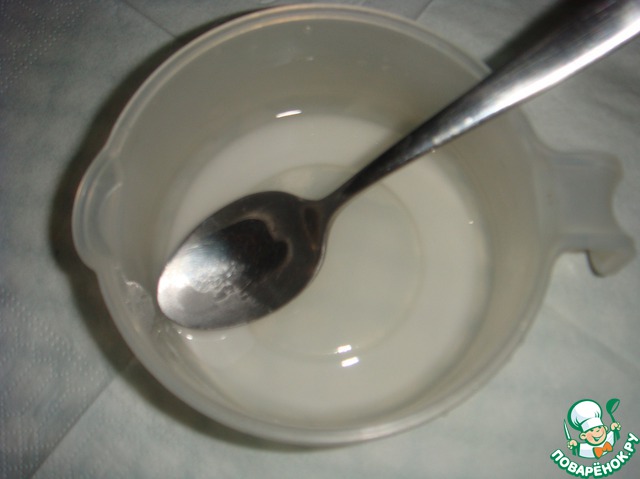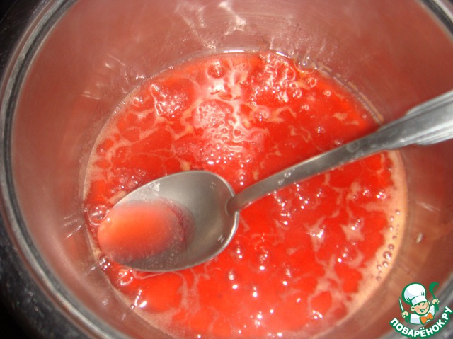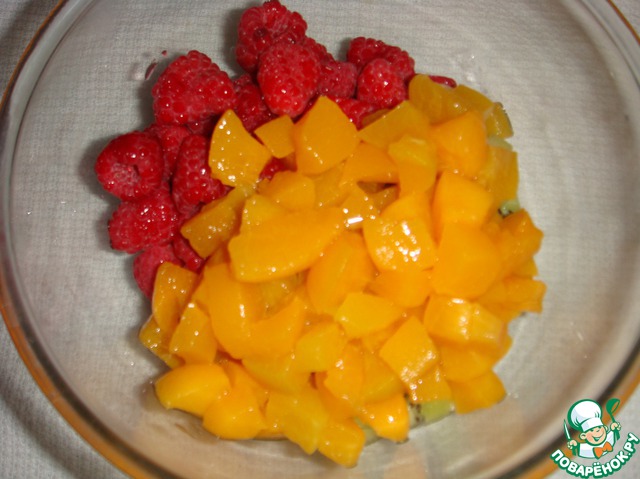 Для соуса с фруктов сцедить маринад в кастрюльку, добавить 2 ч. л. меда, дать закипеть, добавить разведенный крахмал и проварить несколько секунд до загустения.
