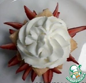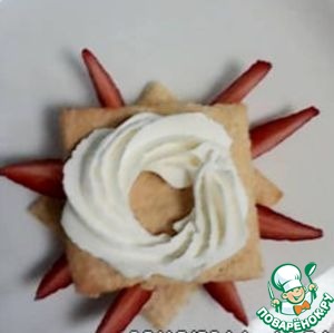 Собрать пирожное: На нижний квадрат отсадить крем и украсить клубникой.